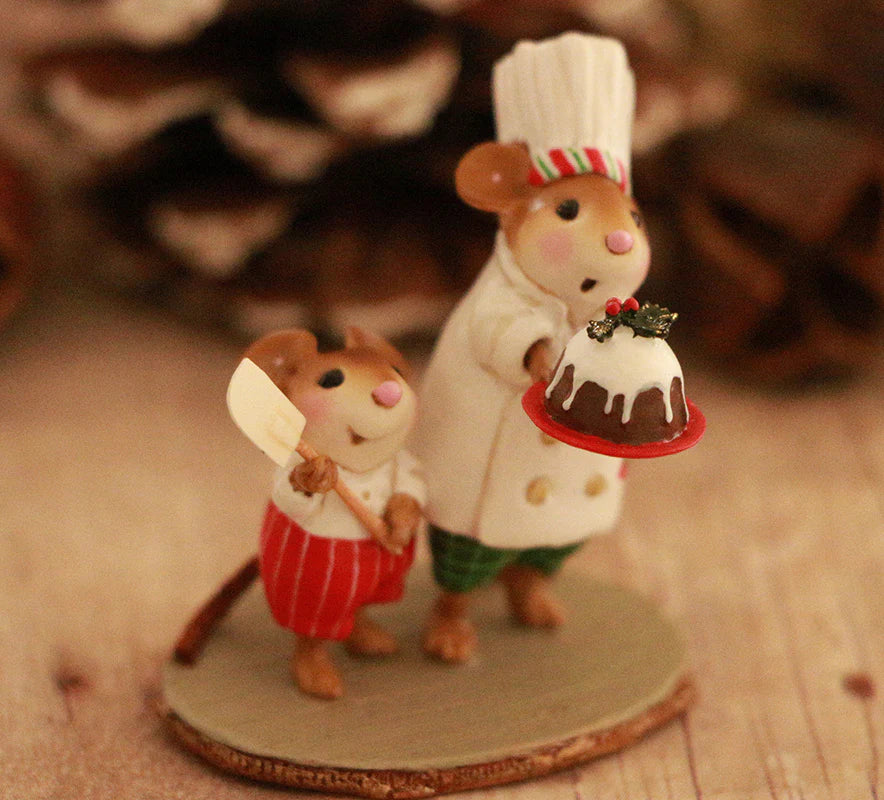Wee Forest Folk M-641a "Christmas Pudding Pals" Limited - This pair has created a Christmas pudding that all will love complete with some sparkling leaves of holly. These two are quite proud to serve such a tasty Christmas treat and you will be astonished with the sweet faces and adorable details of this handcrafted piece. Limited until March 1, 2620. 1.75" x 1.5"